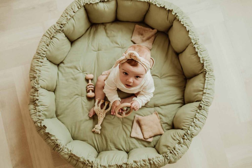 Når barnet vokser, kan babynesten foldes ud og bruges som et blødt legetæppe. Den er let at håndtere, kan rulles sammen og har en hank, der gør den nem at flytte rundt på.